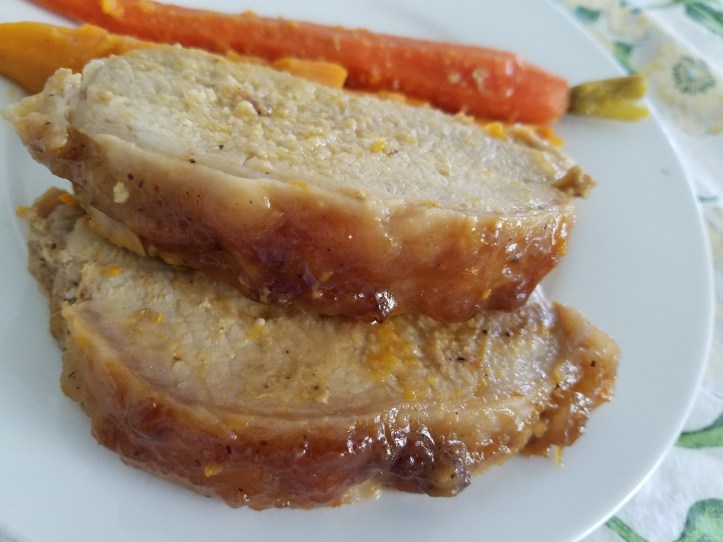 I spread about 3 tablespoons of Dijon mustard all over the top of the roast, then about 1/4 cup of brown sugar…patted it into the mustard. Then after cutting up the sweet potatoes, to be about the same size as the carrots so they would cooked at the same time, I tossed vegetables in a little bit of olive oil seasoned with salt and put them around the roast in the pan. I sprinkle just a tiny bit of brown sugar over all of it and then put it in the oven at 475°. After 30 minutes I sprinkled a little more brown sugar, very little, over everything again and let it finish in the oven. It was all done at the same time after probably a total of 50 minutes and when thermometer in pork reached 160. Again I didn’t make a gravy to go with it because there was enough pan drippings that were very tasty to drizzle over the pork.