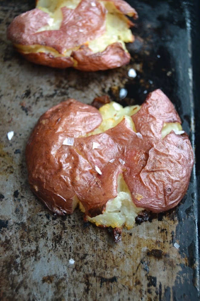 - They’re done when the skins become crispy and start to pull away from the flesh of the potato