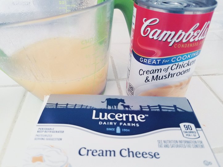 - Melt 2 tablespoons butter in a sauce pan and saute onion and garlic. Add Cream of Chicken Soup, cream cheese, and chicken broth. Stir until smooth.