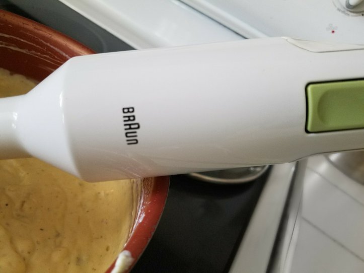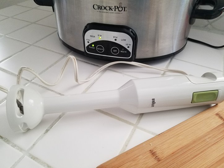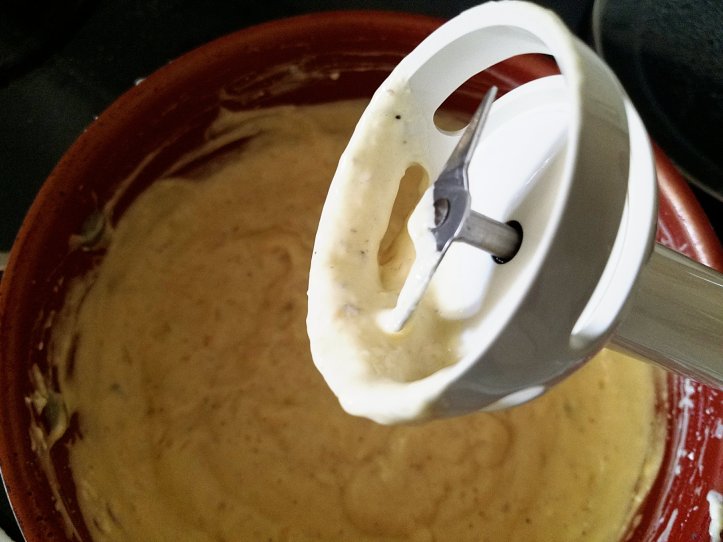 You can optionally brown thighs in a skillet first to add flavor and eye appeal. I prefer that with meats that go in slow cooker/crock pot; although in my pictures I did not do that yet 😉 Also, to mix cream cheese in smoother I used an immersion blender.