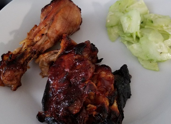 I simply put chicken in slow cooker, poured Sweet Baby Ray’s BBQ Sauce over chicken, turned it on low & left it for 6 hr, right before dinner…put under broiler, to brown. In meantime, i made cucumber salad. Refreshing side to go with the Barbeque flavors. This time I used Olive Garden Italian dressing. Salt and pepper to season. It didn’t make a pretty plate, chicken was falling apart, but it tastes Damn Delicious , for real. I will be making that more often, especially with the heat coming. Today was 99° so here comes the slow cooker hahaha. Anyway was all good. Very tasty.