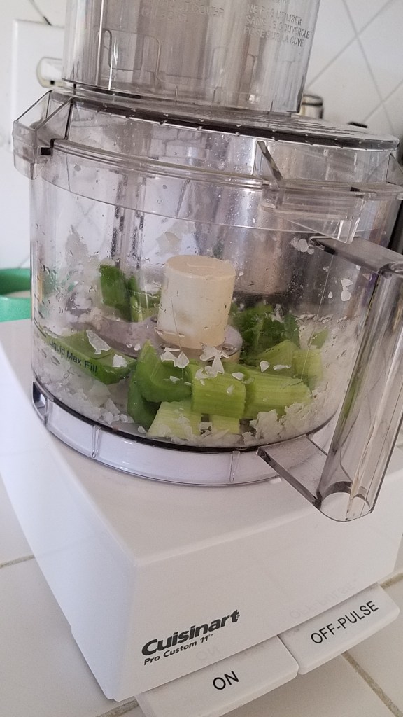 I did a couple things different mostly because of my family members (one being a teenager) who doesn’t like (or won’t be as happy with) some veggies; in this case…celery and green peppers. I trick them by pulverizing them in the food processor. Ha! Where there’s a will there’s a way. And maybe I should but don’t cook and set aside; I push cooked to sides of pot, making a well for next ingredient