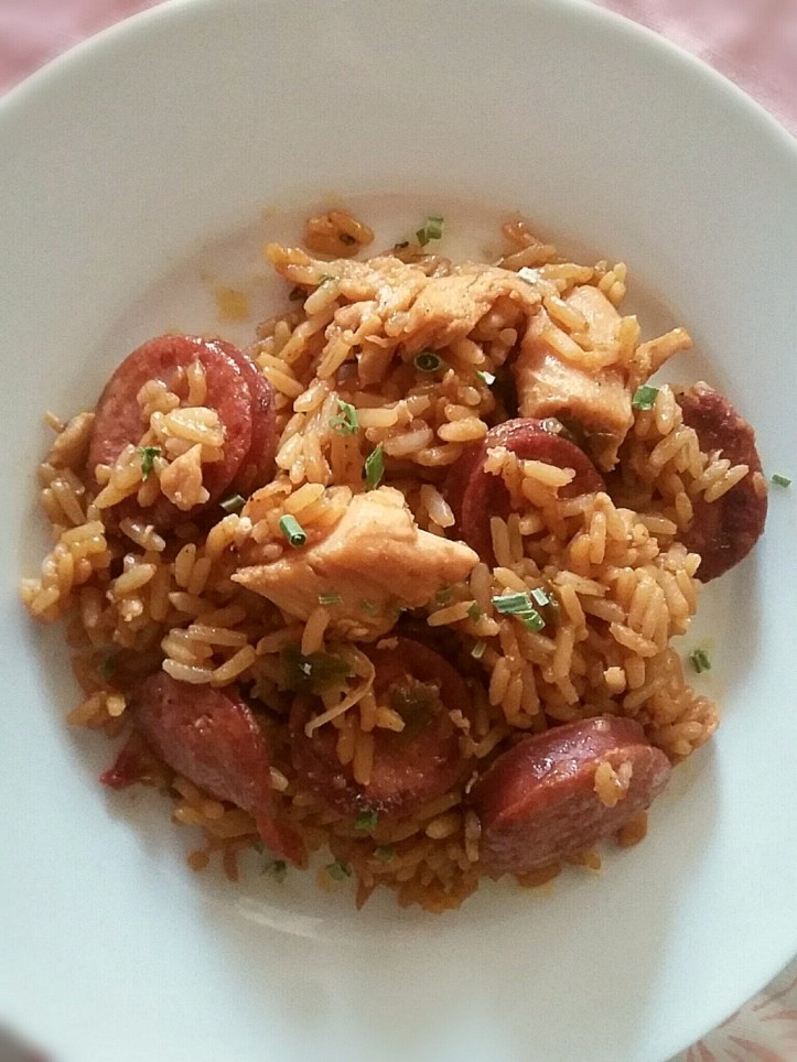 Jambalaya, a one-pot New Orleans favorite, always includes meat or seafood and vegetables; this easy rendition is full of chicken, spicy andouille sausage, bell pepper, and onion.