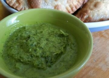 I was looking through recipes of empanadas and learned that the condiment “Aji” must accompany them. And that it can go on just about anything. Reading the ingredients makes it plain to see why. It’s basically a salsa verde or green salsa. There are as many different recipes as there are tacos; I liked this one myself. They vary greatly, especially depending on where they come from…Peru, Columbia, South America, etc..