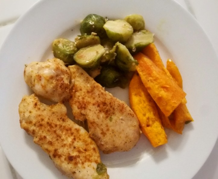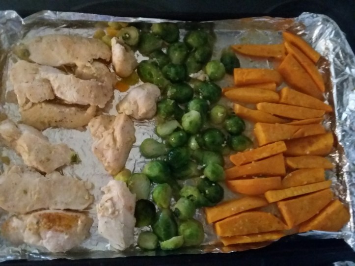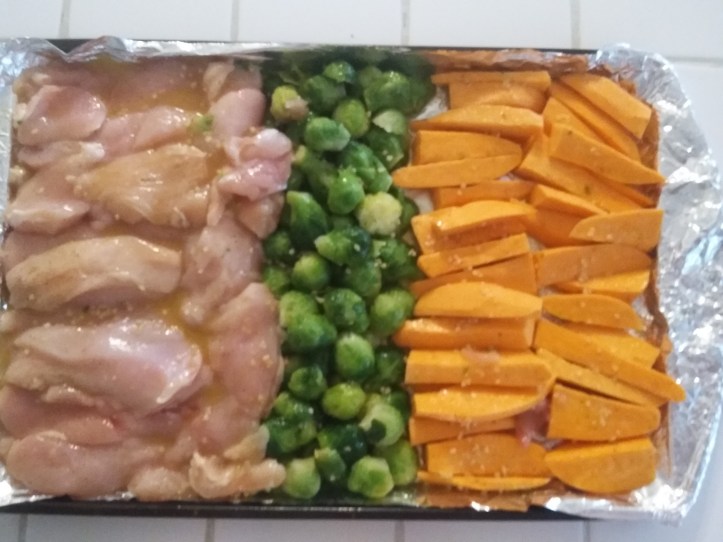 Chicken strips (seasoned with salt, pepper, garlic powder, seasoned salt like Lawry’s, paprika), sweet potatoes cut in wedges or planks and Brussel sprouts cut in half, spread out on sheet pan, drizzle olive oil on all, season veggies. Place in 400° oven, 30 minutes or when thermometer inserted in chicken reads 160°.