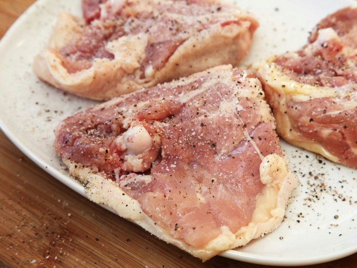 Clean chicken, pat dry, and trim off any excess fat. Season both sides of chicken with seasonings. Place chicken, skin side down, on lined (foil, parchment paper, silicone sheet) baking sheet. Put in 400° oven, 25 minutes.