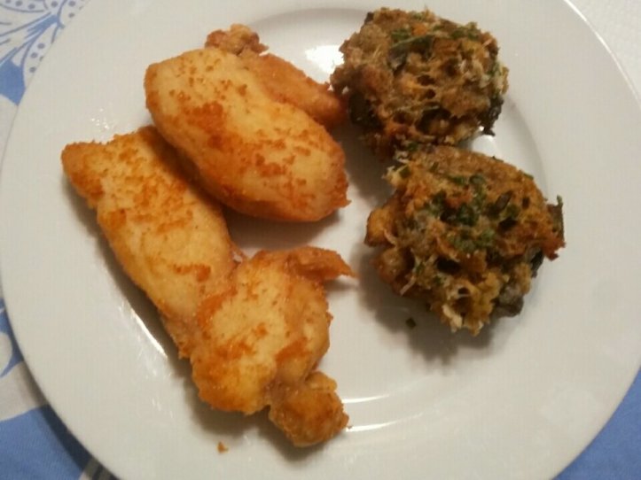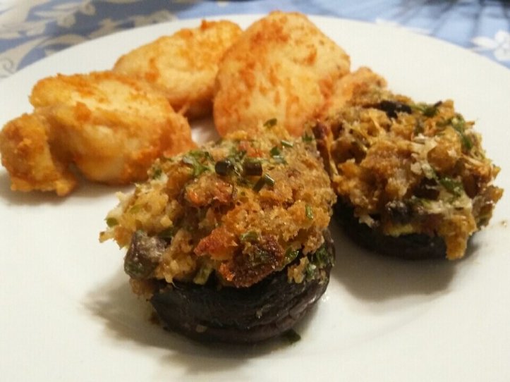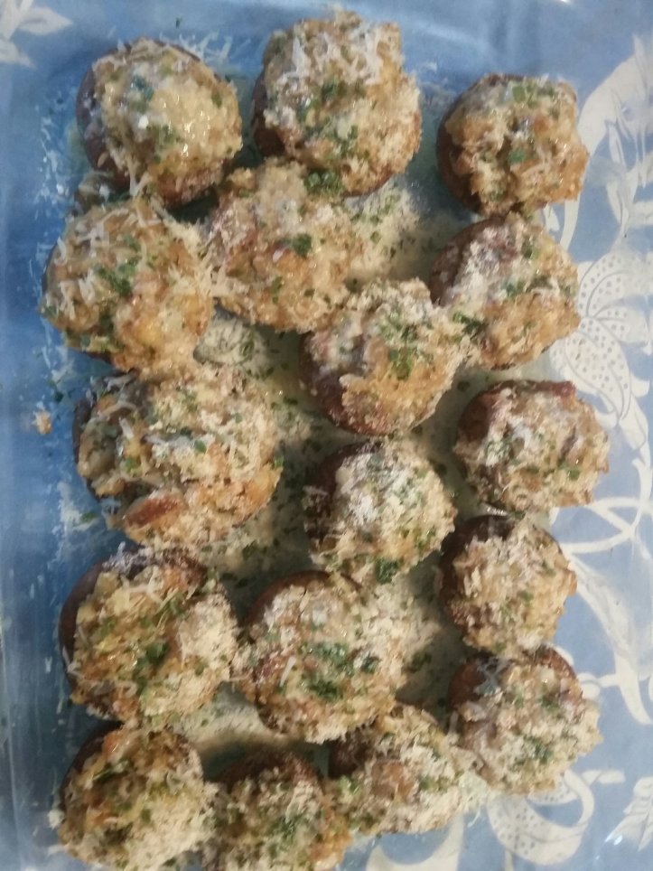 Hopefully I get this all down…going by memory. Basically you make a regular stuffing/dressing mix, then add crabmeat, cheese and GARLIC BUTTER.