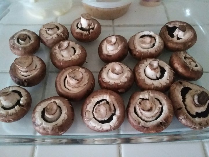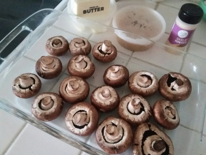 Stir 2 minced garlic cloves and 1/2 tsp garlic powder into remaining butter. Use a tablespoon or 2 on bottom of baking dish. Dip (or brush on) mushroom caps in garlic butter and place in baking dish, continue with each mushroom. Then fill each mushroom with stuffing, mounding on top.