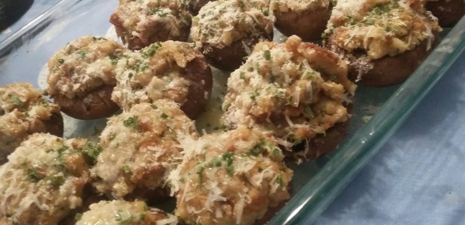 Hopefully I get this all down…going by memory. Basically you make a regular stuffing/dressing mix, then add crabmeat, cheese and GARLIC BUTTER.