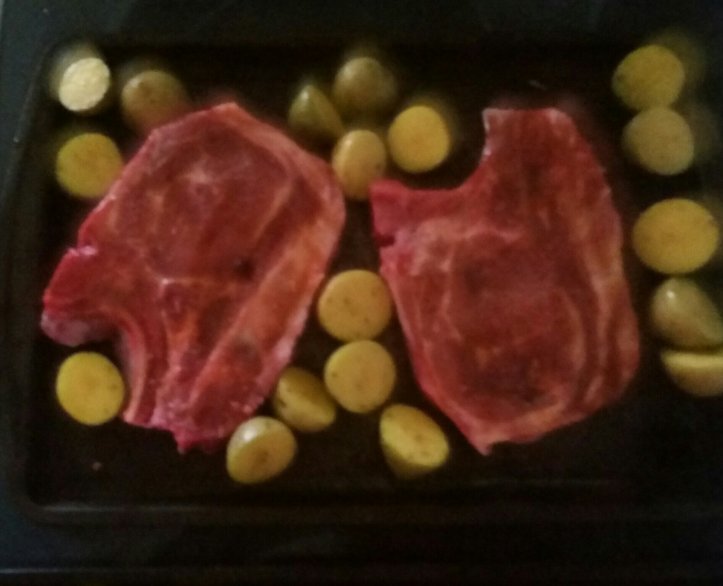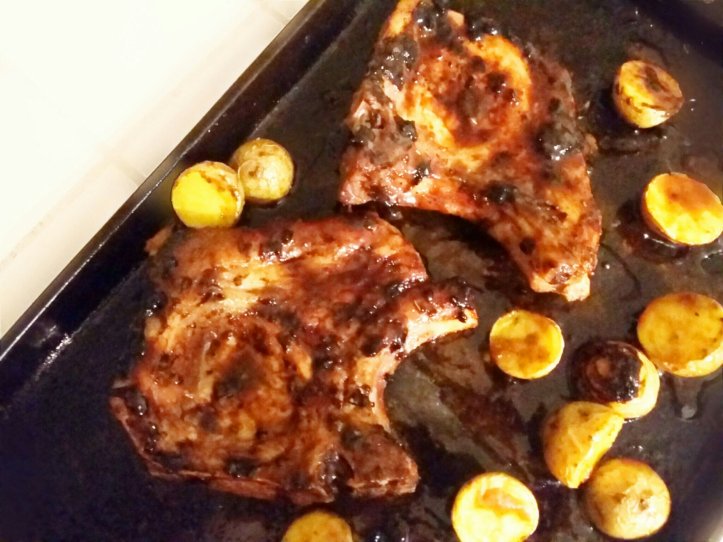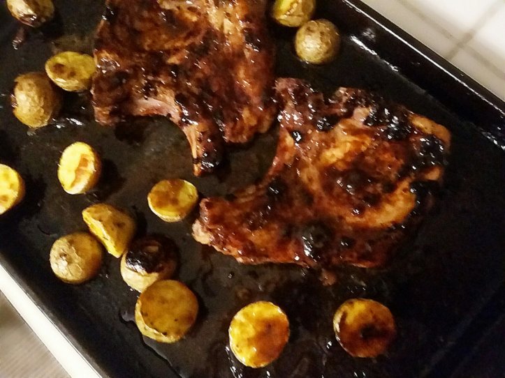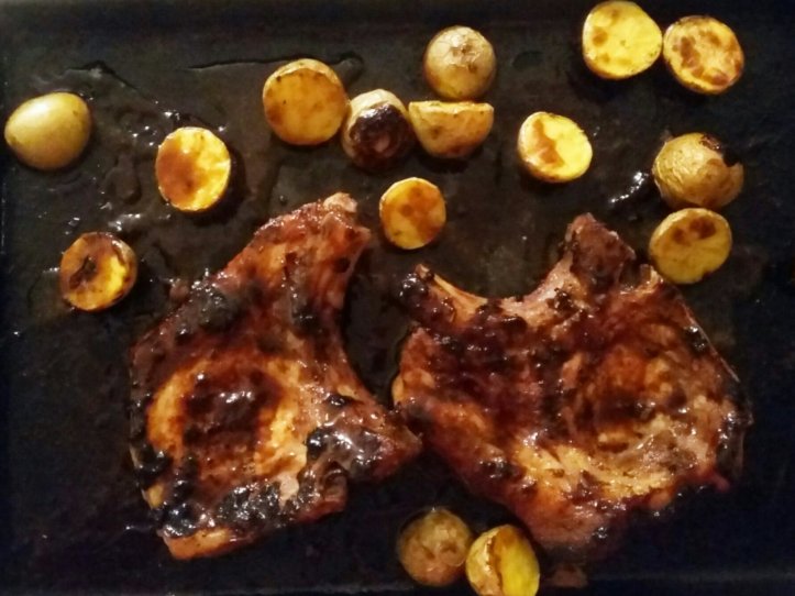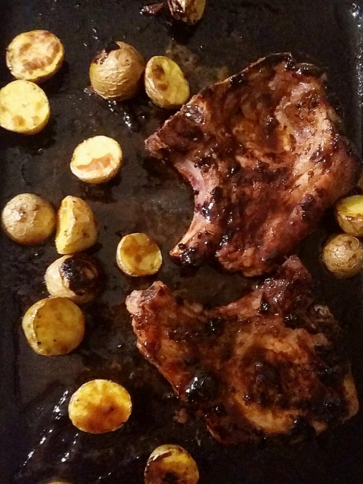 Preheat oven to 200C / 390F (fan forced / convection) or 220C / 430F (standard oven). Toss potatoes in oil, sprinkle with salt and pepper. Scatter on baking tray. Place in oven for 15 minutes (giving them a head start).Pork