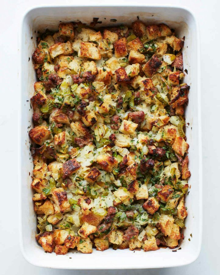 - Melt 2 tablespoons of butter in a large skillet over medium-high heat. Add the sausage and break up with a wooden spoon. Cook until it loses most of its pink color, but not so much that it’s dry, about 5 minutes. Add the sausage and pan drippings to the stuffing cubes. Melt the remaining butter in the pan. Add the onion, apple, celery, and salt. Cook until the vegetables get soft, about 5 minutes. Add the broth and parsley and bring to a boil.