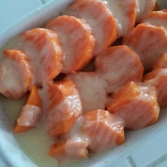 In a small saucepan, melt butter. Whisk in sugar and salt until smooth. Pour evenly over the potatoes. Bake until potatoes look shiny and glazed, 25 to 30 minutes. Serve hot or warm