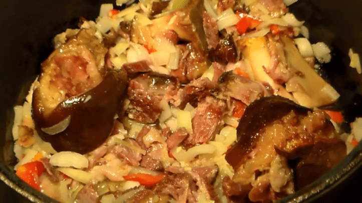 Place a big pot over medium heat and add 3 tbs of oil to the pot. Add the sliced bacon onions and red pepper and stir