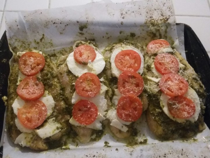 Pesto Mozzarella and Tomato Chicken, Easy 4 ingredient chicken, Caprese Chicken Bake? Whatever you want to call it. Tastes great. Balsamic vinegar would be awesome on this; next time.