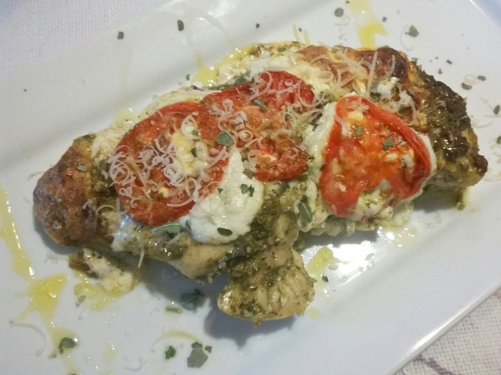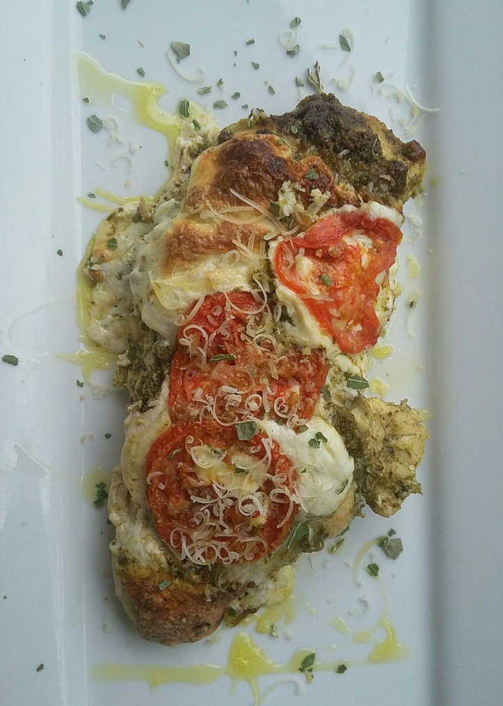 Easy. Good. You don’t really need a recipe for this. 4 chicken breasts (mine were large), 1/2 cup pesto, fresh mozzarella and tomato. I want to throw in that I did marinate mine in buttermilk half the day; don’t know if that’s why it turned out so moist. Anyway, season chicken breasts with salt and pepper (I couldn’t resist a little garlic powder), on lined baking sheet rub pesto sauce all over chicken, place slices of fresh mozzarella on each and tomato slices. Bake at 400° for 30 – 40 minutes (depends on size of chicken) or until thermometer reads 165° and cheese is starting to brown. I removed pan from oven and added parmesan over it. Also with drizzled evoo. Tastes really good. Stayed very moist and tender.