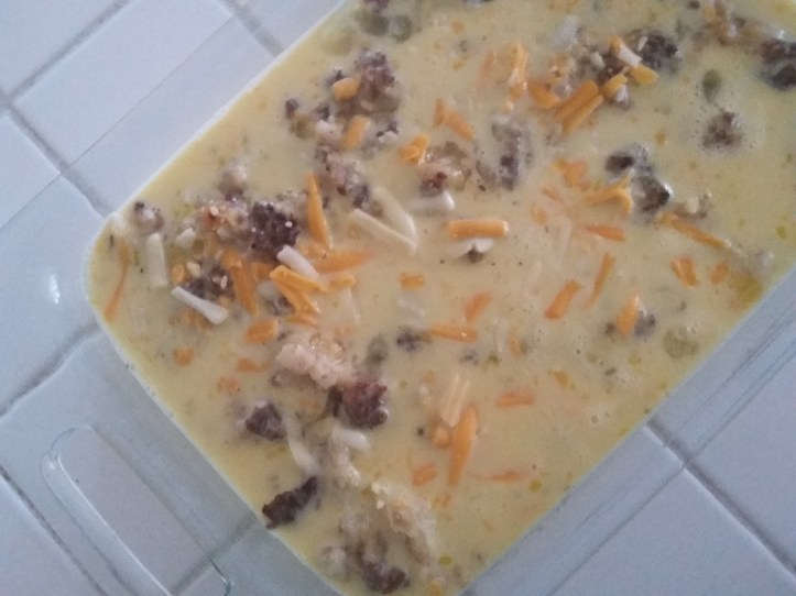 Stir together hash browns, sausage, and cheese. Pour into a lightly greased 13- x 9-inch baking dish.