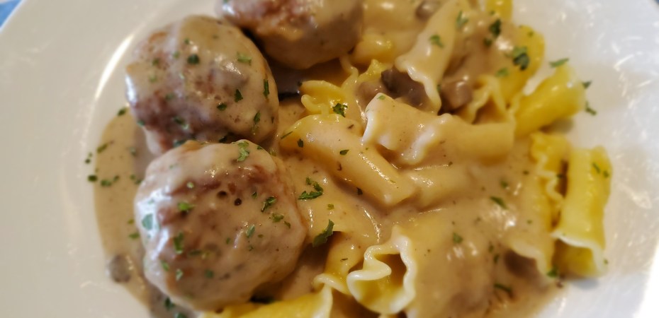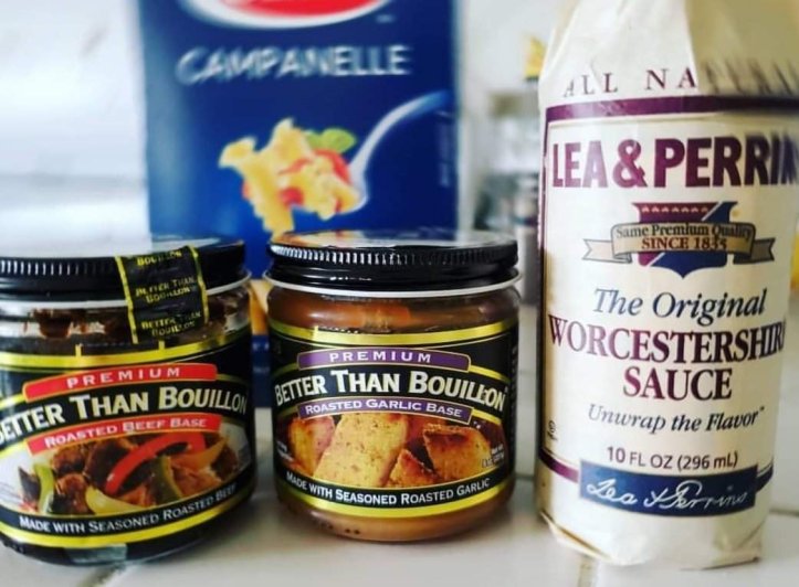 I just changed up a few things. I use Better Than Bouillon, both Beef Base and Roasted Garlic Base. I used some heavy cream, and some freshly ground nutmeg. I didn’t use sherry. Anyway, it tastes great! It also went really good with campanelle pasta because it holds sauces and/or gravies really well. Happy family. ♡