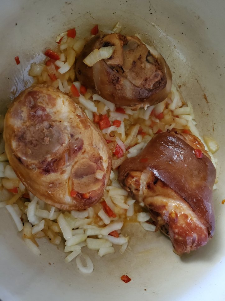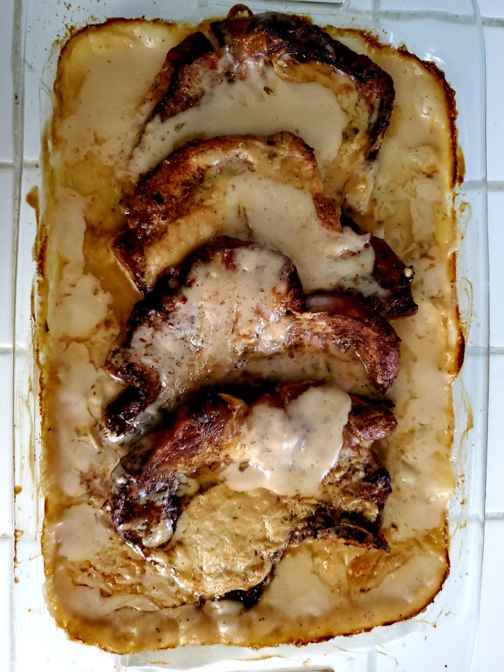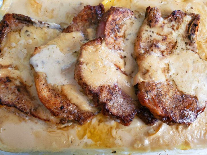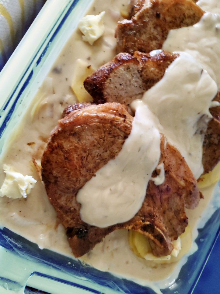 Sliced potatoes (5 – 7, depending on size) thin on mandoline, layered that & a little onion in buttered casserole dish. Then poured gravy or sauce over potatoes, reserving enough to spoon some on top of chops. Laid chops on top of potatoes, then spooned sauce down center of chops. I’m sure I didn’t need added fat, but I did dot top with bits of butter 😉