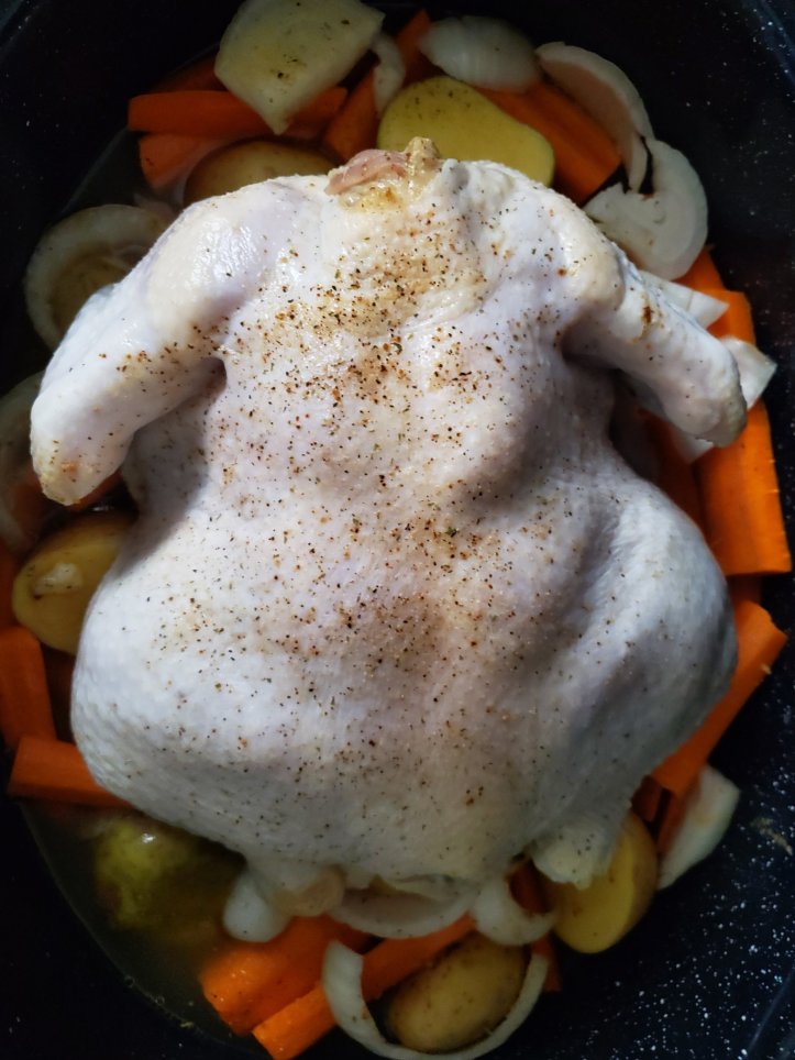 - Pop the chicken breast-side up on top of the vegetables, and drizzle the other Tbsp oil over the chicken and sprinkle the chicken rub on.