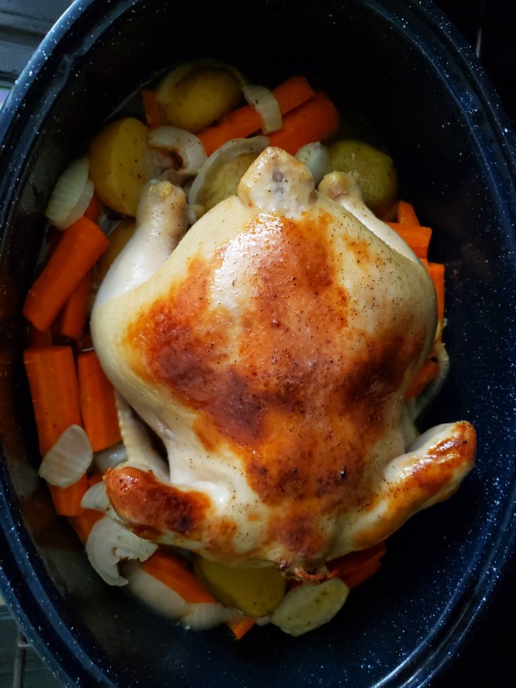 For juicy, melt in the mouth chicken, lots of chefs will turn the bird over during cooking. To an extent it’s an oven version of a chicken rotisserie, (which we all love right?) as it makes sure there is even cooking, as the heat penetrates the bird evenly. This makes sure the meat is nice and moist, and although it takes a bit more care and attention than just whacking it in the oven, it’s definitely worth it, if you like juicy chicken with a lovely crispy skin!