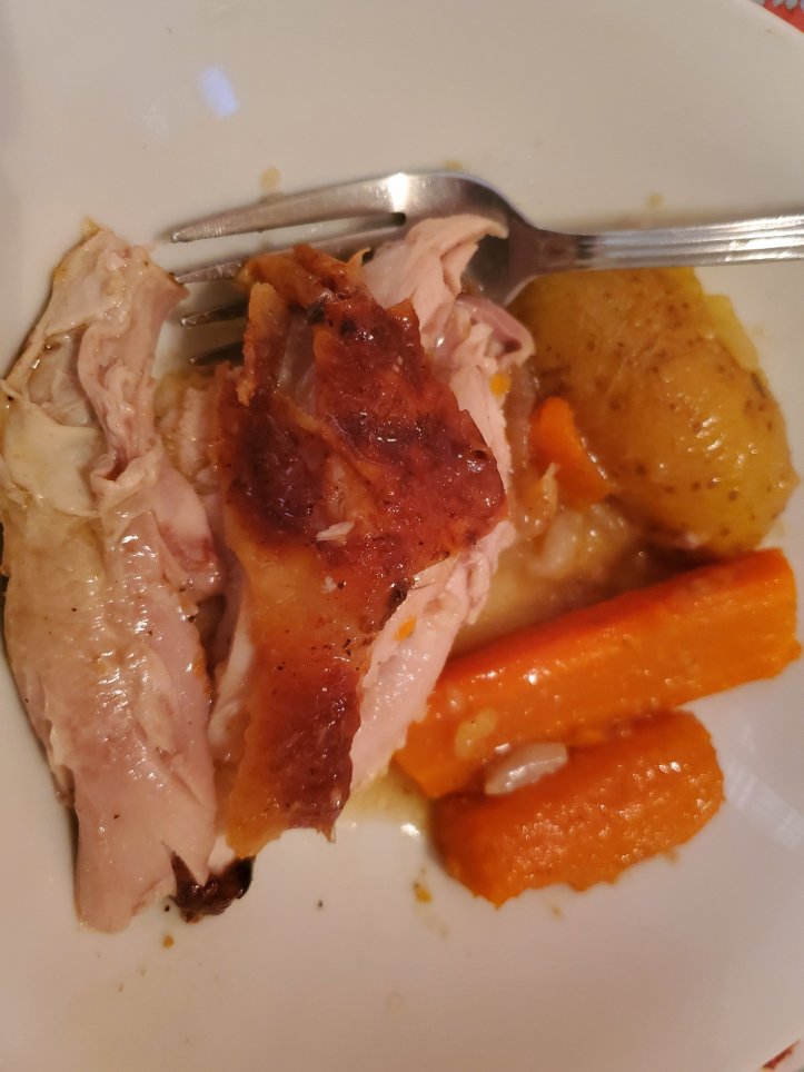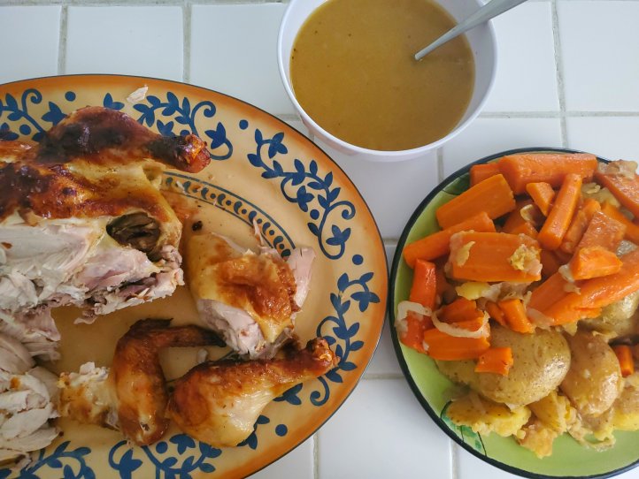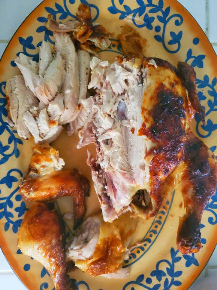 I made the mistake of cooking this when it was 108°, so I didn’t flip 3 times this time, just once. Still good, roast chicken always is. Sometimes I think I like the gravy the best 😉