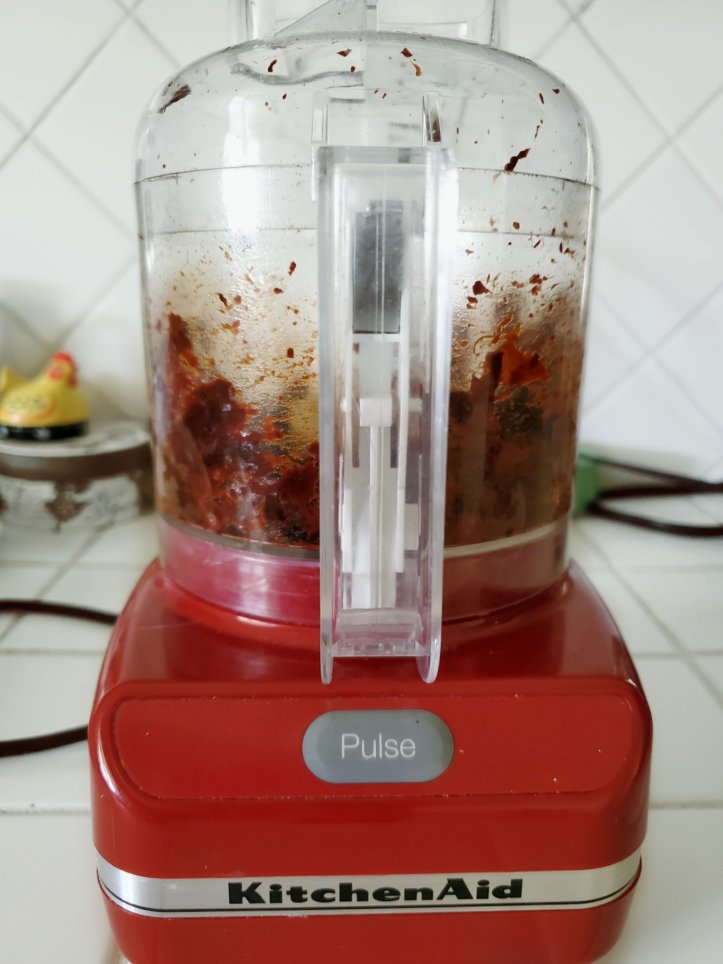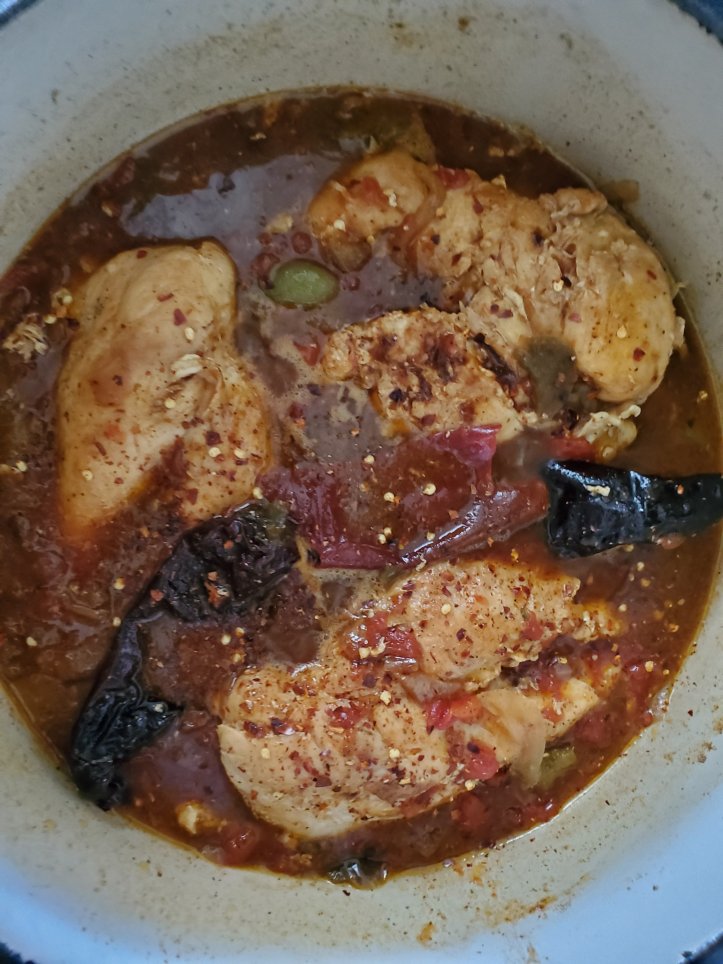 I am posting a basic chicken tinga recipe from Mexican Food Journal, although I sometimes use what chili pods I have in my pantry; which this time was guajillo and Hatch New Mexico chile pods, along with chipotle chilies with adobo sauce. Also I use fire ROASTED tomatoes.