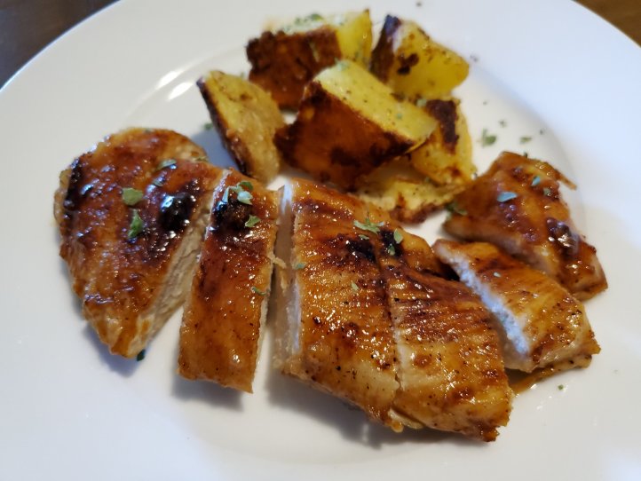 Preheat oven to 450 degrees. Mince garlic and add to brown sugar, along with oil. Then add enough water to a thick glaze consistency. Put the chicken on the sheet pan and season with salt and pepper, then spread 1/2 the garlic and sugar mixture over the chicken. Bake 15 minutes, flip chicken over and spread remaining glaze on chicken, bake additional 15 minutes. I couldn’t resist spooning a little extra juice off pan onto chicken after plating😊