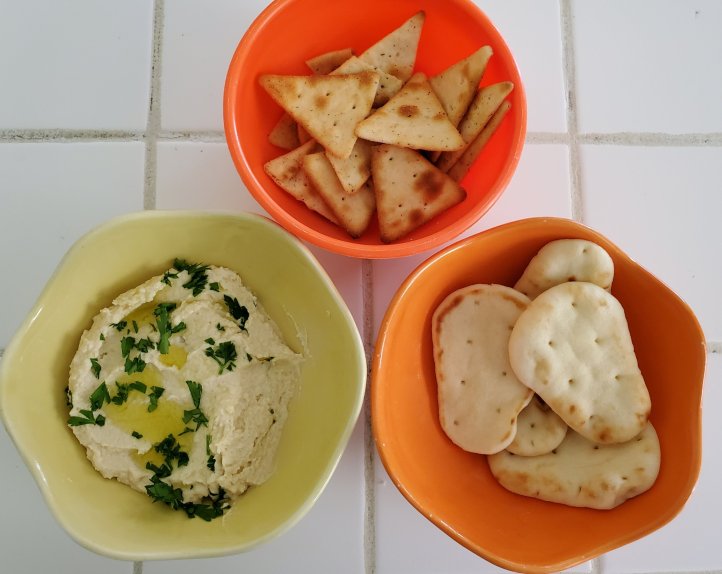 Snacking on freshly made #hummus (thank you #baizmarket 😉💖) w/their #EVOO, fresh #parsley (was on sale! That calls for a #Gremolata ), #pitachips & #stonefireauthenticflatbreads mini #naan 😜😁 + bc of them I’m making #oatmealdatebars! A favorite since childhood.