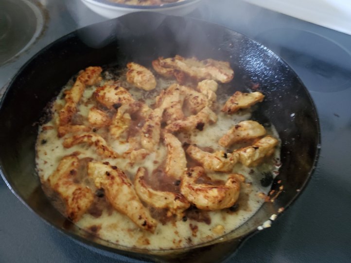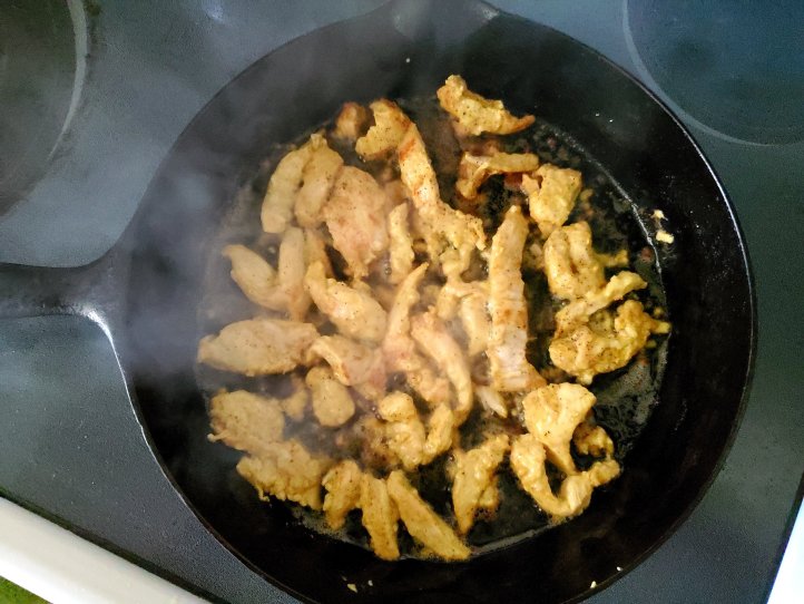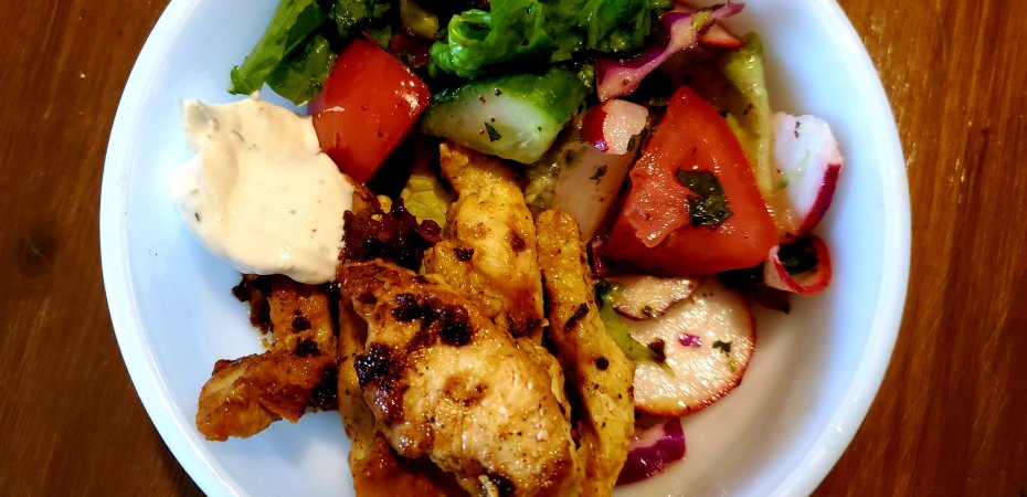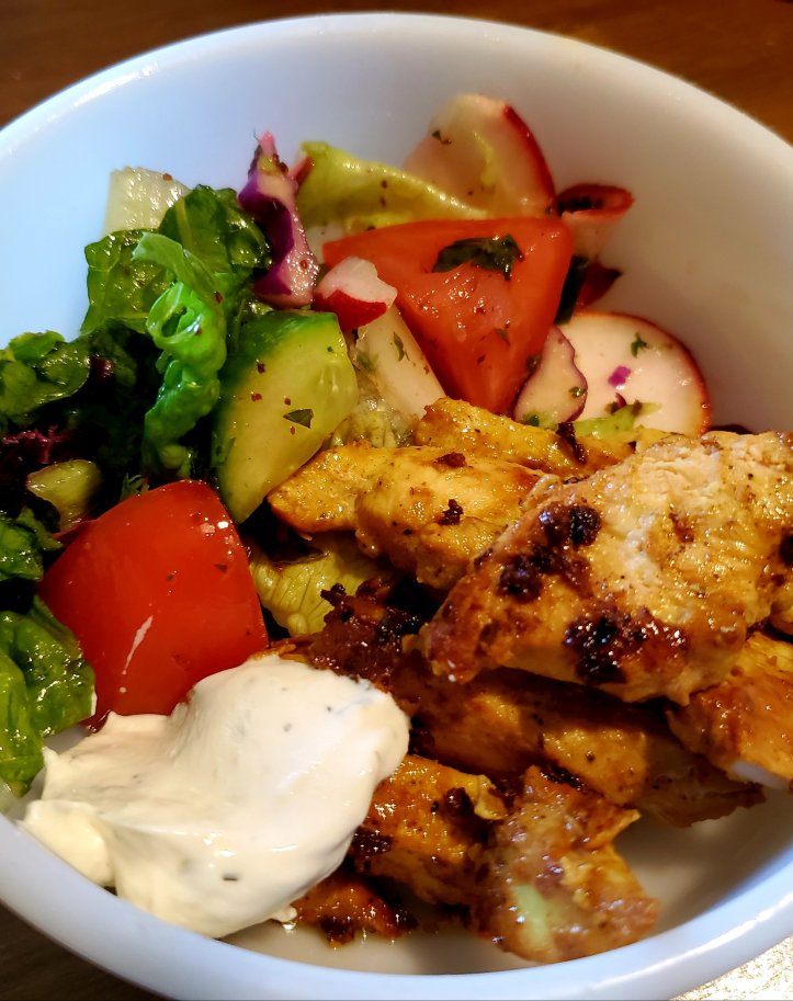 SO I bought already marinated chicken shawarma. The marinade seemed made with yogurt, it was a yellow color with a earthy flavor and a spiciness that wasn’t hot; I don’t know what’s in their marinade; maybe cumin? curry powder or paste? turmeric? I do know it was good! 😜 My plan was grilled kabobs, even soaked the skewers, BUT I suddenly changed my mind (I believe it’s the excessive heat we’ve been under 🥵🌡) and threw it in a HOT cast iron skillet 🍳🔥🐓 I ate mine with the fresh Mediterranean Salad from same market – DELISH‼ Along with their Tzatziki sauce 🥰