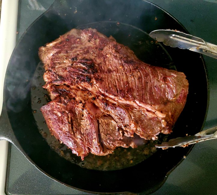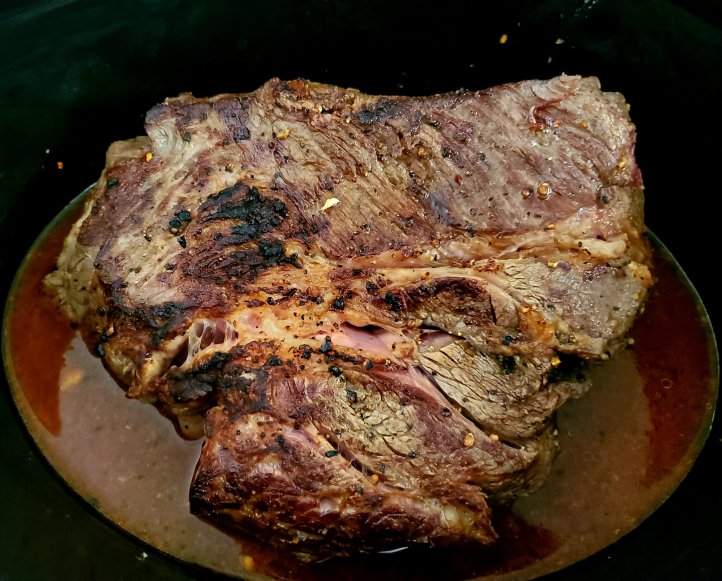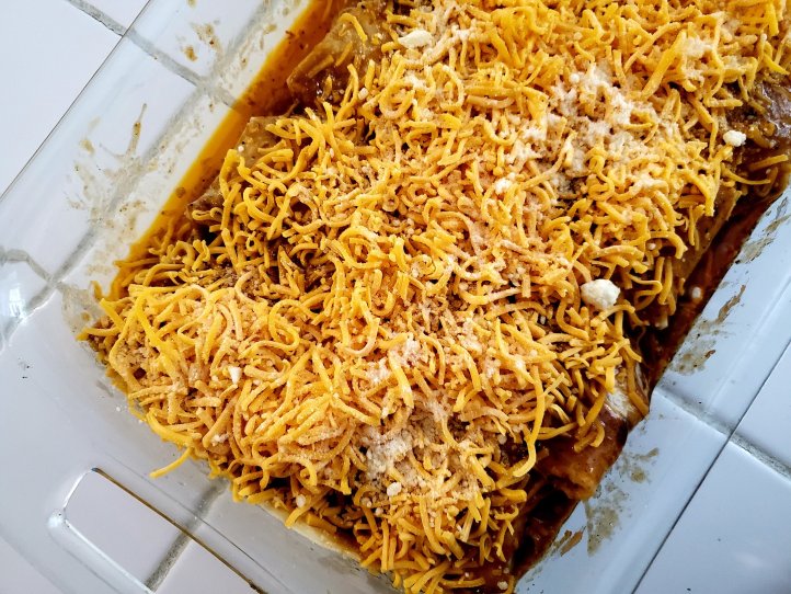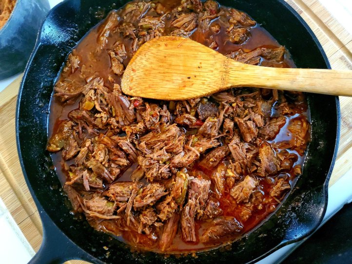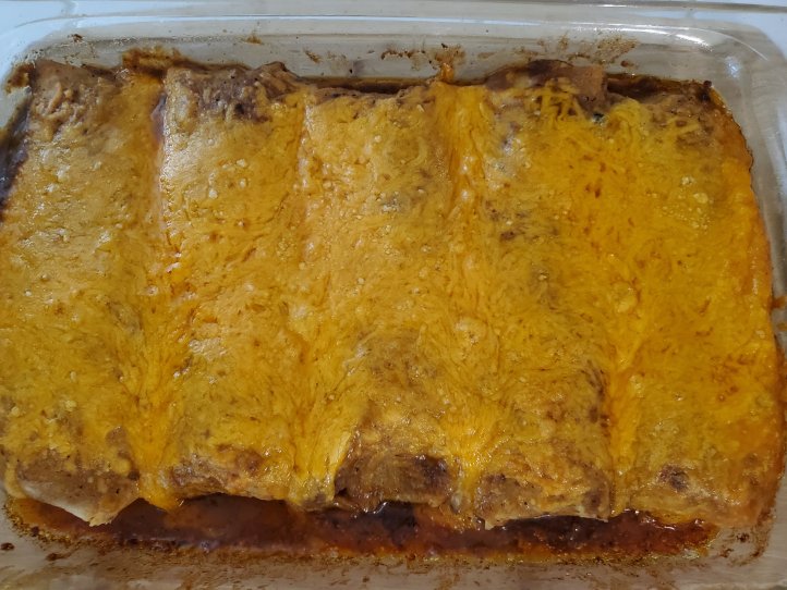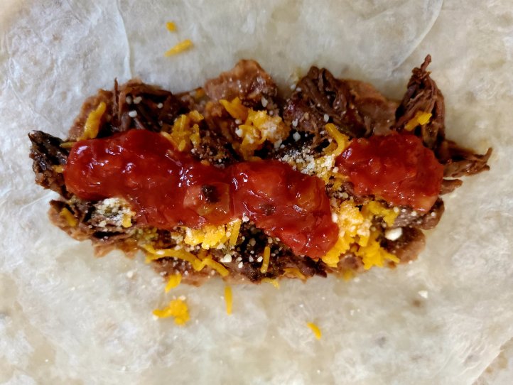 In same skillet used to sear the beef.. make a roux with equal parts oil & flour, season, cook flour taste out (5 minutes?), add sauce from crock of slow cooker (I placed crock on stovetop next to skillet & ladled it in), stir as it thickens, reserve 1 cup, add beef, stir to blend. Good fresh flour •tortillas, •refried beans, •cheese, •salsa or pico de gallo ; •smear refried beans on center of tortilla, meat on top of that, then cheese and salsa, fold and place seam side down in 9×13 baking dish. Pour reserved sauce over burritos and top with cheese. 350° oven about 20 – 30 minutes or until desired doneness on cheese topping.