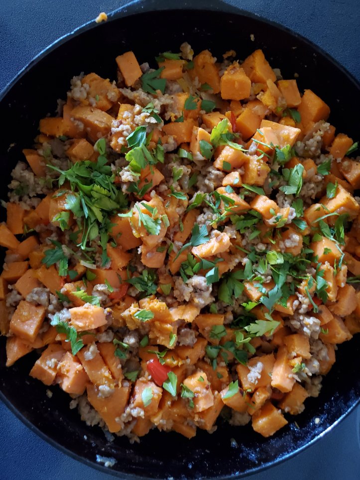 Cook sausage in medium nonstick or cast iron skillet, breaking apart as it cooks. Stir in seasonings. Add onion and red pepper, stir and cook 2-3 minutes longer. You might have to add a little oil to pan, approx 2 tablespoons. Then add sweet potatoes, continue to cook until they start to caramelize, about 10-12 minutes.