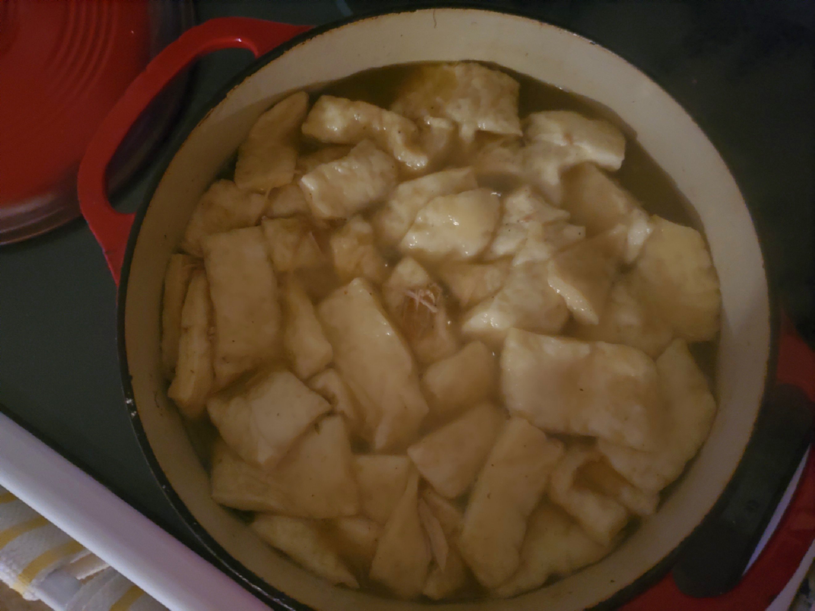 I made turkey stock, strained, poured stock back into pot and picked out the turkey meat to add back to pot. Then made dumplings, dropping into pot……By the way, I’m going to add a little heavy cream 😉
