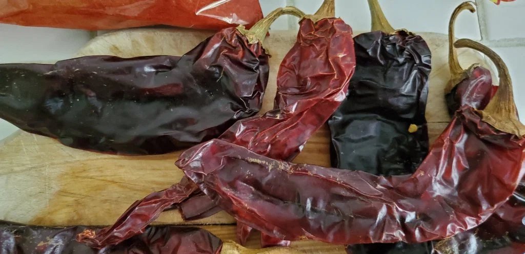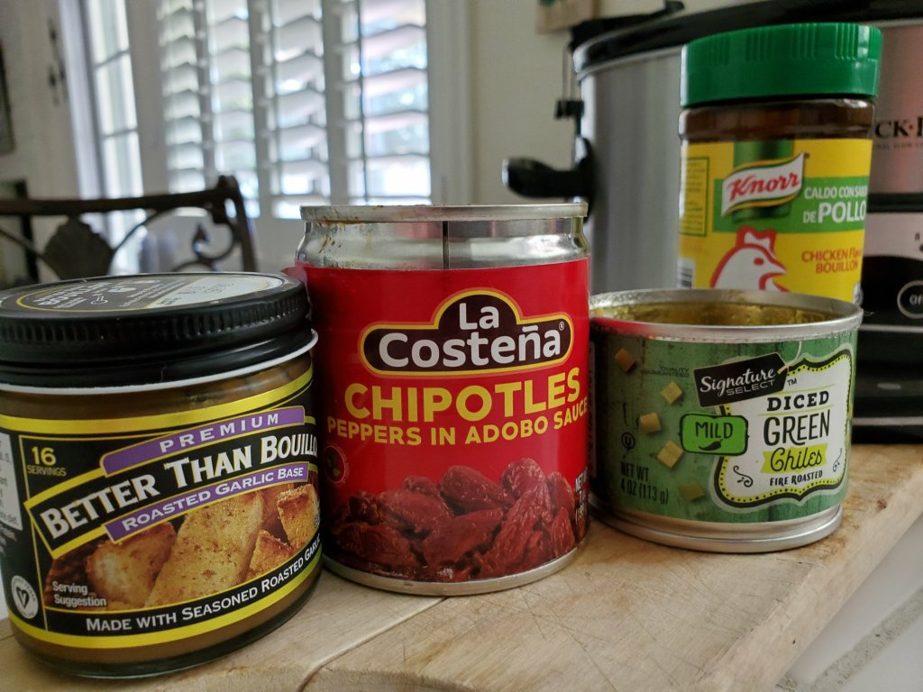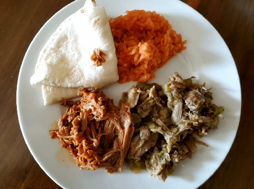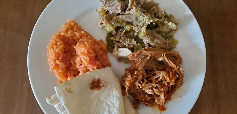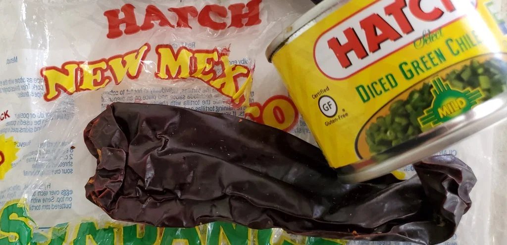 Or Chile Colorado. I lightly browned pork in a little oil…in 2 separate pans; for chile verde/green chile I added 1 can of diced green chile (Hatch 🤭) & a jar of La Victoria Salsa Verde. For chile roja or chile Colorado I used multiple kinds of softened chile pods, guajillo, Hatch New Mexico & chipotle…with onion, garlic, a little broth (to desired consistency & taste) & seasoning in blender, then poured over other pork. Typically chunks of pork is used but I had a LOT of leftover pork from day before.
