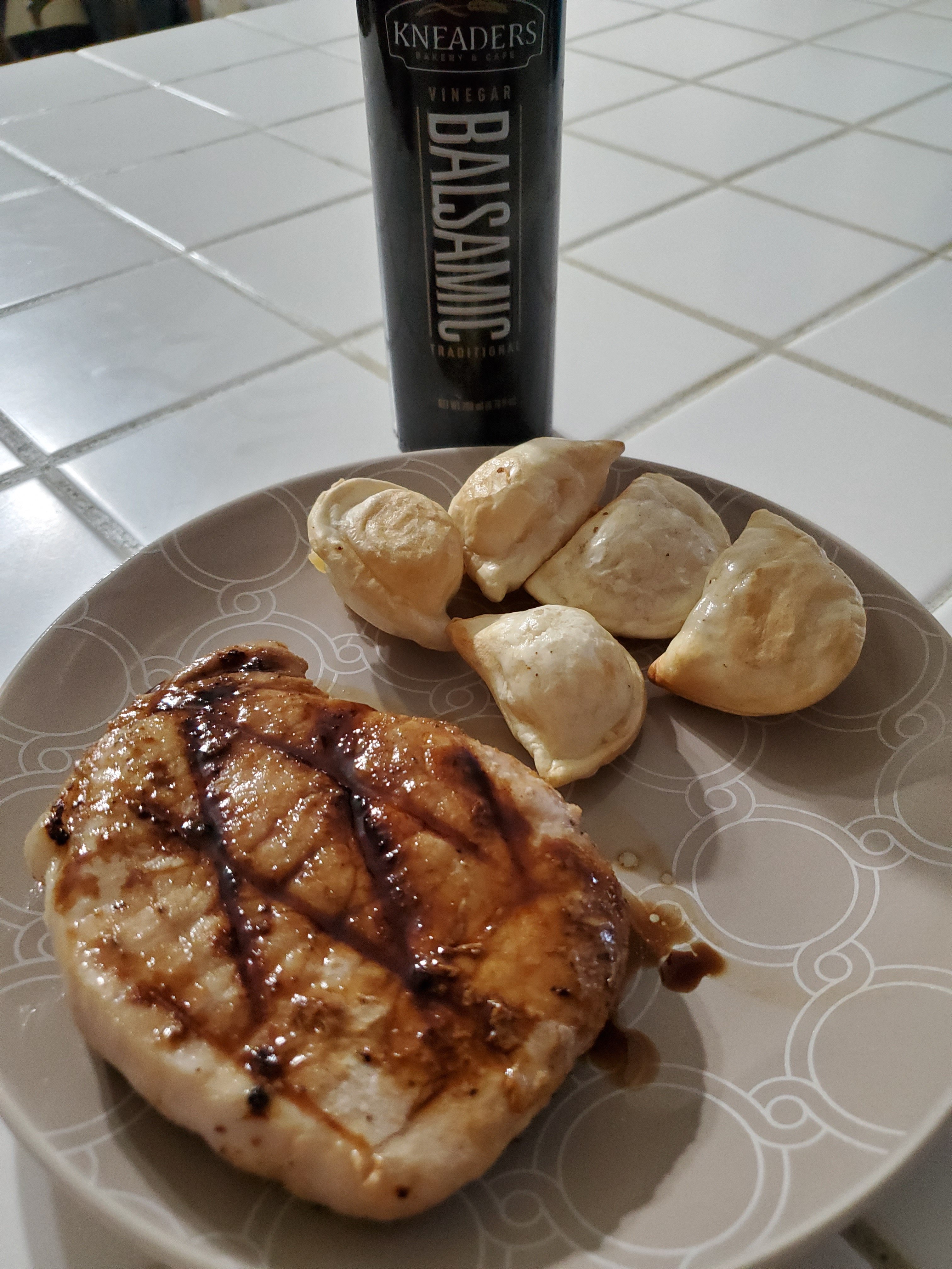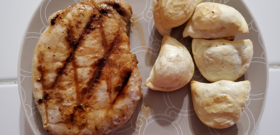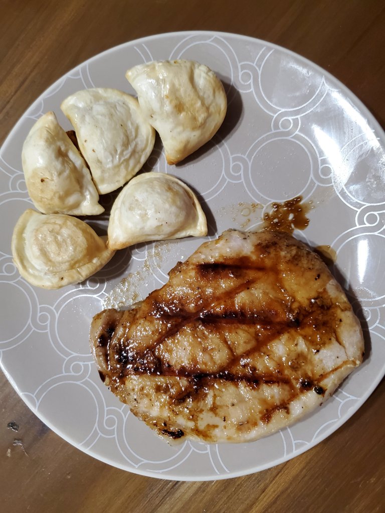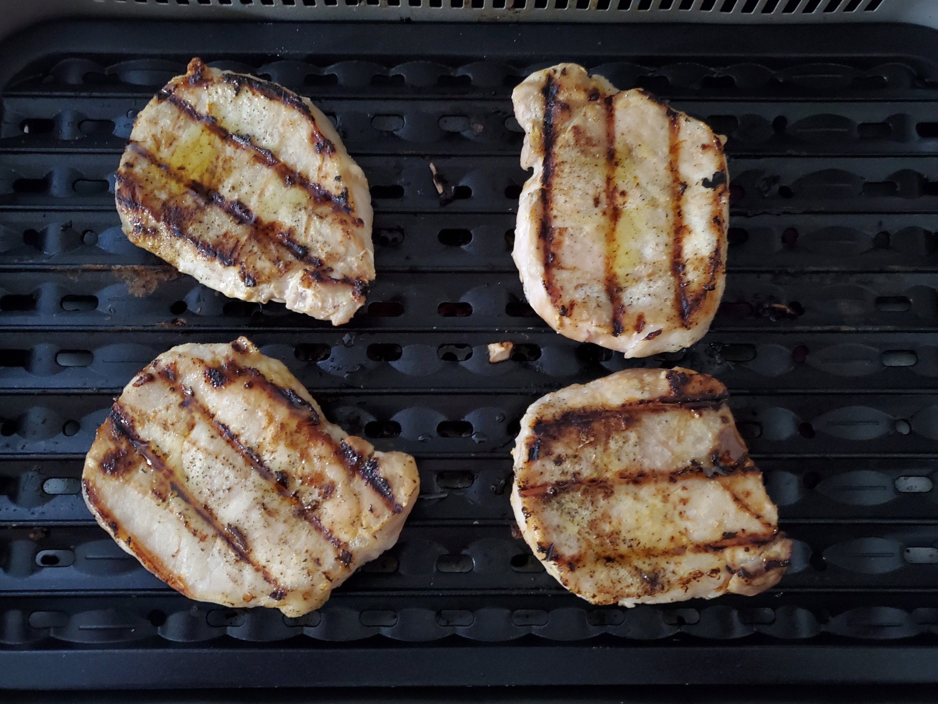 Pork chops on indoor grill…DELISH! 😋 @ 450°, 4 minutes on one side, 3 minutes on other.