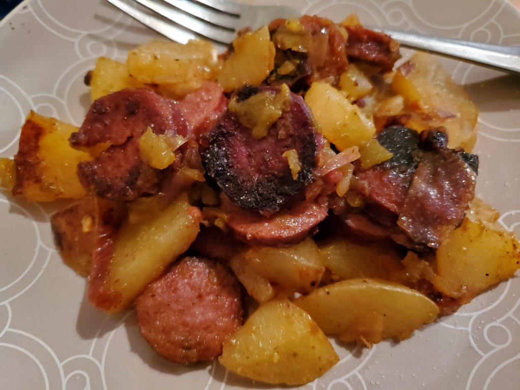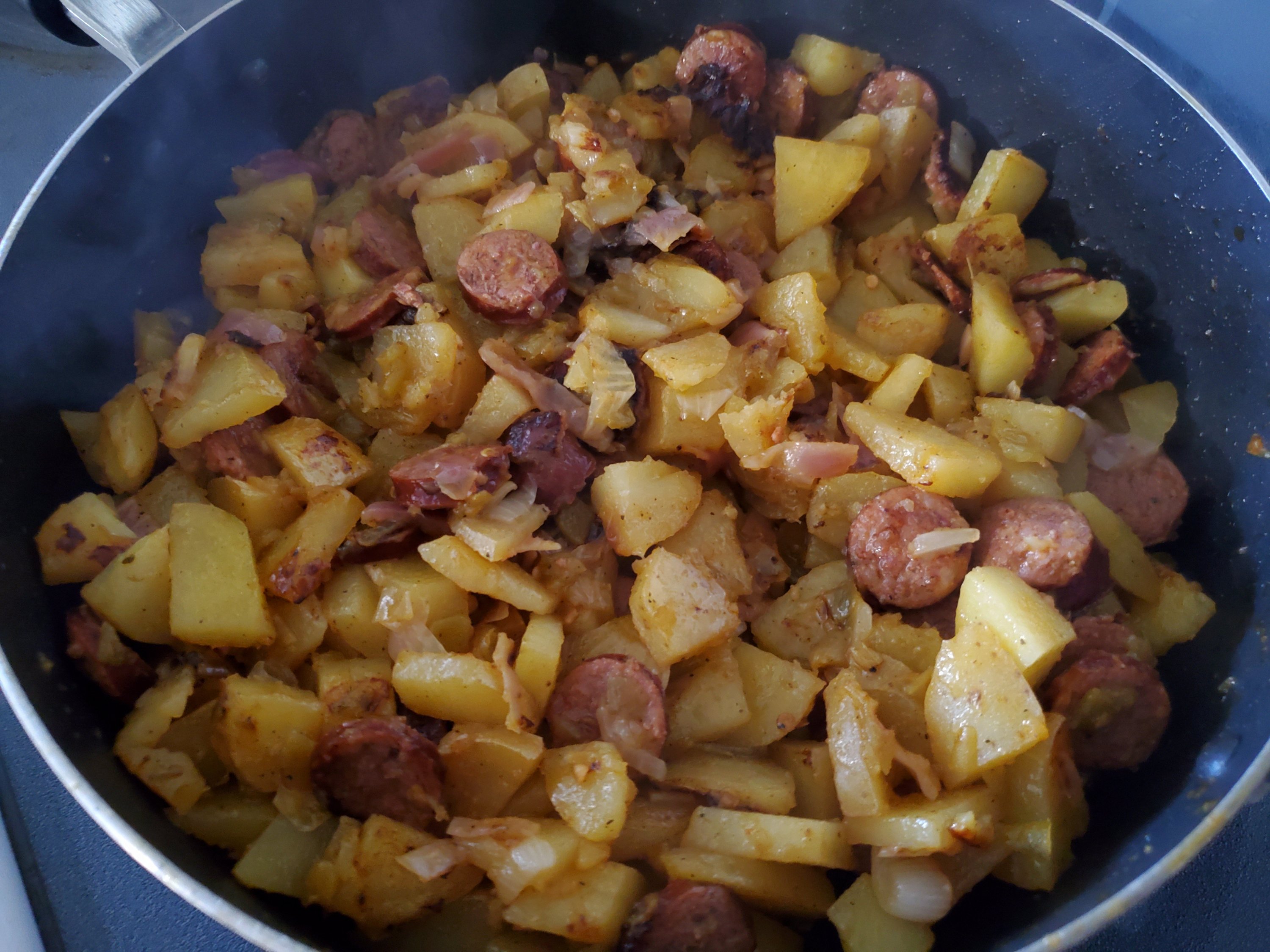 I made fried potatoes and onion, but I added Hatch green chile and sausage this time 😋 cajun style andouilli smoked sausage; any kind would be good 😉 it was delicious!