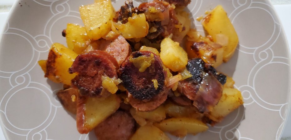 I made fried potatoes and onion, but I added Hatch green chile and sausage this time 😋 cajun style andouilli smoked sausage; any kind would be good 😉 it was delicious!