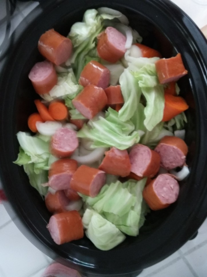 - Layer the cabbage, onion, potatoes, carrots, and sausage in a 5 or 6 qt. crockpot.
